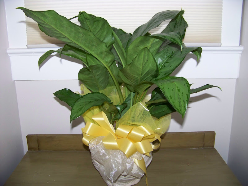 The dumb cane (b-day present from hubs) was upgraded to this cool planter. (Just plopped in) But, I'm going to have to remove all that plastic wrap and ribbon, it hinders my watering skills.